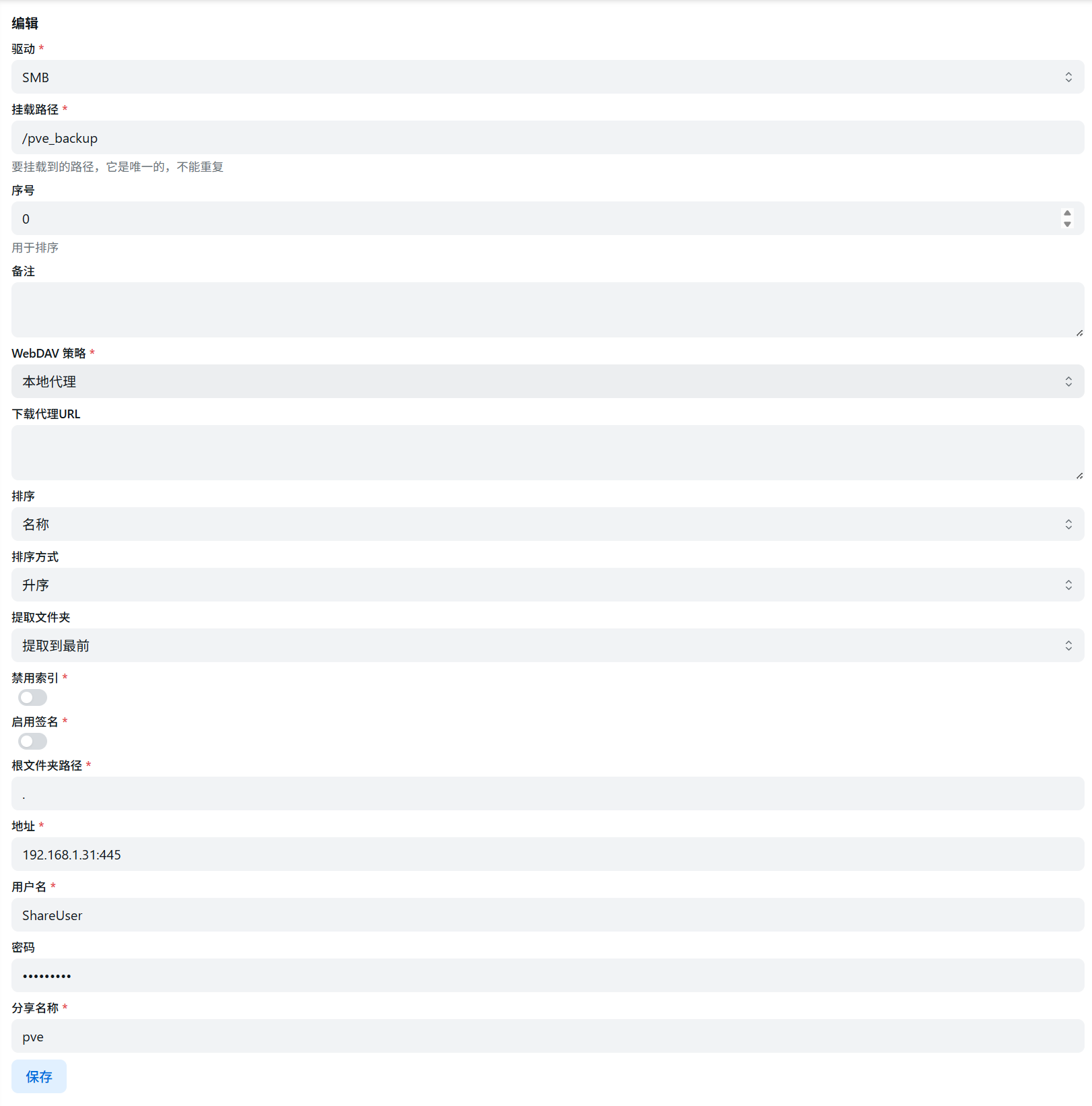 # 设置远程账号 User name user> admin #alist的账号 # 设置远程密码 Password. y) Yes type in my own password g) Generate random password n) No leave this optional password blank y/g/n> y #这里输入y Enter the password: #alist密码,密码是看不到的 password: Confirm the password: #再次输入密码 password: