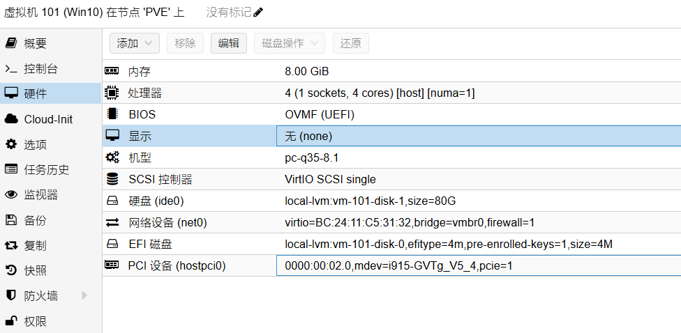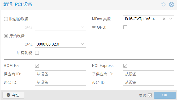 添加PCI设备:核显GVT-g(勾选ROM-Bar和PCIE在Mdev类型中选择vgpu设备)
