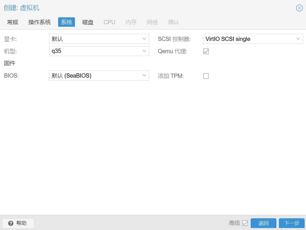 SCSI控制器: 选择默认的VirtIO SCSI就行,这是PVE官方推荐的。