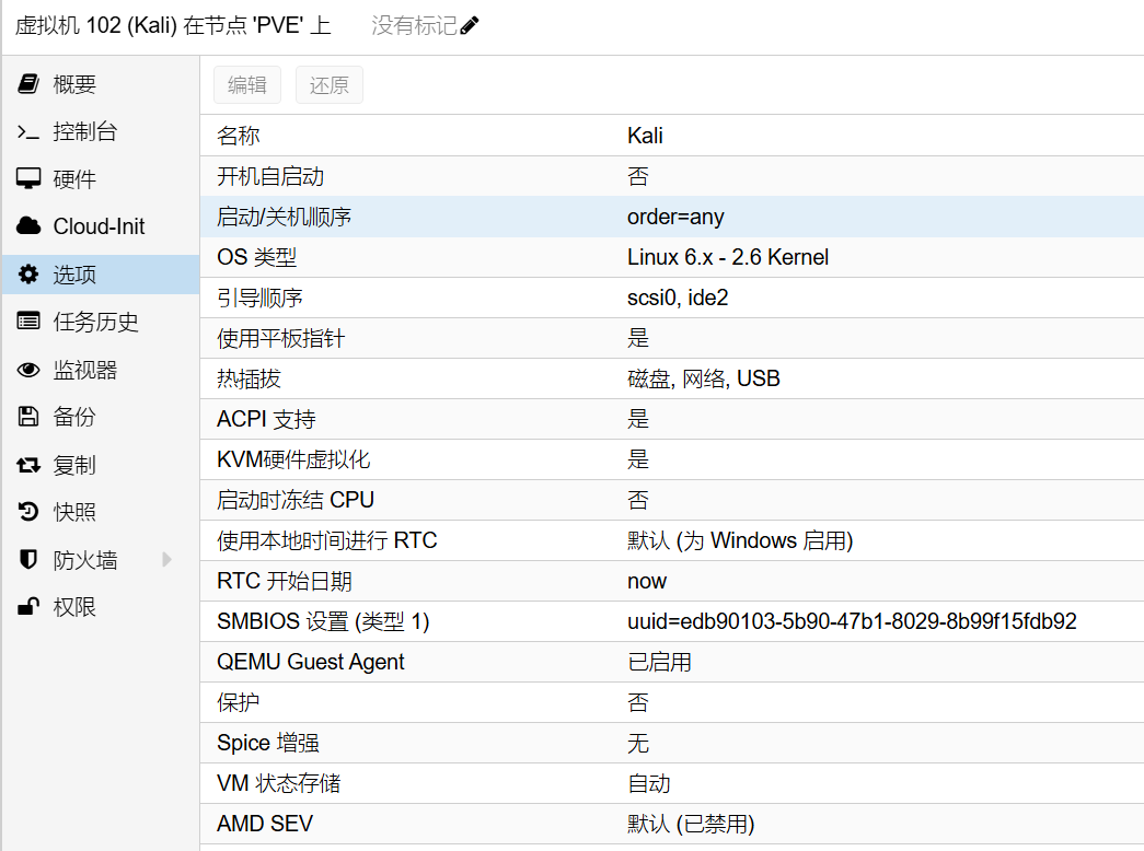 开机自启动和启动/关机顺序:可以设置虚拟机跟随PVE自动启动和关机,适合配置自动任务。其中,顺序的数值表示开机顺序,数值1表示PVE启动后第一个被启动,关机则相反,最后一个关机。启动延时指的是当前虚拟机开机后到下一个虚拟机开机的时间间隔,单位是秒。关机超时是超过这个时间未完成关机,PVE会强制关机。