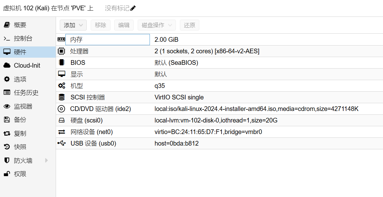 虚拟机创建完成后,在硬件里可以修改虚拟机的硬件配置,添加PCI、USB等设备